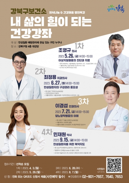 이순희 강북구청장은 “많은 분들이 강좌에 참석하셔서 전문가들로부터 건강관리에 관한 실용적인 조언을 얻어가길 바란다”며 “강북구는 앞으로도 구민의 질환예방과 삶의 질 향상을 위한 건강 프로그램을 도입하는데 힘쓰겠다”고 강조했다.