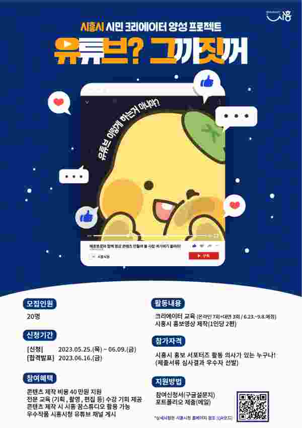 [금요저널] 시흥시는 창의적인 콘텐츠를 발행하고 참신한 시정홍보로 도시브랜드 가치를 한껏 높여줄 ‘2023 제4기 시민 크리에이터 양성 교육’ 참가자를 5월 25일부터 6월 9일까지 모집한다.