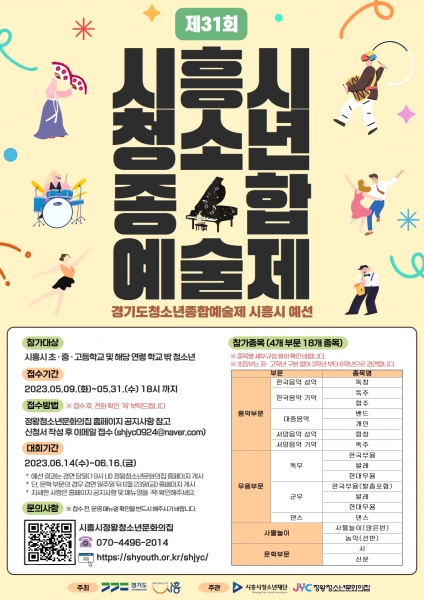 [금요저널] 시흥시와 경기도가 주최하고 시흥시청소년재단 정왕청소년문화의집이 주관하는 ‘제31회 시흥시청소년종합예술제’에 참여할 청소년을 5월 31일까지 모집한다.
