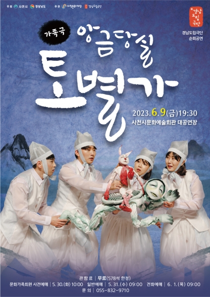 [금요저널] 사천문화재단은 오는 6월 9일 오후 7시 30분 사천시문화예술회관 대공연장에서 경남도립극단의 가족극 ‘앙금당실 토별가’ 공연을 선보인다.