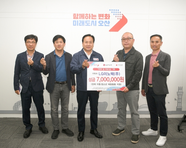 [금요저널] LG이노텍이 지난 24일 오산시 장애 아동청소년 체험활동 지원을 위해 써달라며 시장 집무실에서 700만원을 전달했다.