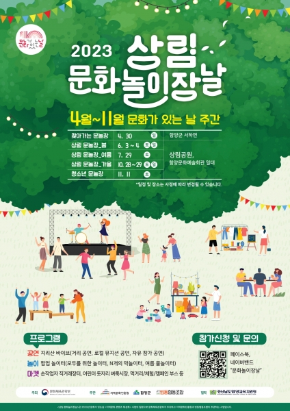상림 문화놀이장날이 지난해와 달라진 점은 개최 장소를 상림 연지공원 잔디광장에서 문화시설 접근성과 이용자의 편리성 등을 고려해 함양문화예술회관 잔디광장으로 변경해 개최되며 참가신청 및 문의는 페이스북, 네이버 밴드 ‘#문화놀이장날’로 하면 된다.