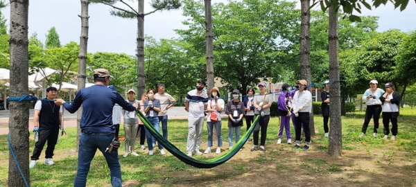 이번 교육에서는 숲 활동 안전수칙 등 이론 적인 교육뿐만 아니라, 일상생활에 밀접한 로프를 이용해 위기 상황을 극복할 수 있는 방법, 매듭법을 활용해 구조물 만들어보기 등 다양한 체험을 진행했다.