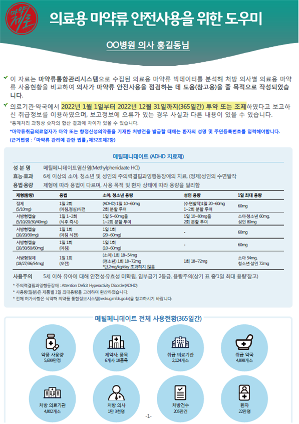 지난해에는 의료용 마약류 28개 성분을 처방한 의사 27만 6,231명에게 제공했으며 올해는 ADHD 치료제와 진해제를 추가해 총 32개 성분을 처방한 의사 32만 3,650명에게 본인이 의료용 마약류를 과다·중복 처방하는 지를 쉽게 비교·검토할 수 있도록 제공한다.