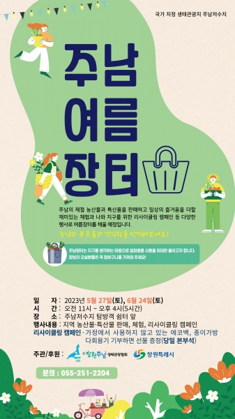 오는 27일 ‘주남 여름 장터’는 오전 11시부터 오후 4시까지 주남저수지 탐방객편의센터 앞 공터에서 개최되며 6월과 9월부터 11월까지 매월 마지막 주 토요일에 4회 더 개최될 예정이다.