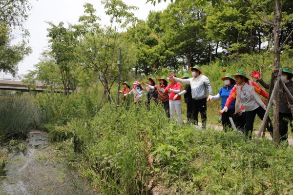 [금요저널] 정왕2동은 지난 24일 쾌적한 군자천을 만들기 위해 군자천 산책로 주변 생태교란식물 퇴치와 환경정비 활동을 실시했다.