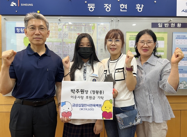 김영구 정왕1동장은 “어려운 이웃을 생각하는 박주원 학생의 따뜻한 나눔 실천에 깊이 감명받았다”며 “후원금은 복지 사각지대에 있는 어려운 이웃을 돕는 데 소중히 사용하겠다”고 전했다.