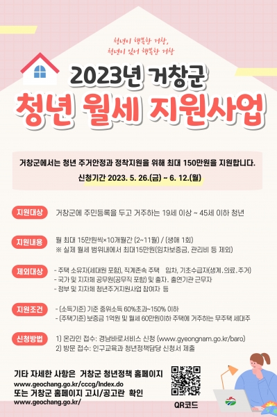 [금요저널] 거창군은 청년의 주거비 부담 완화와 정착을 돕기 위해 2023년 청년 월세 지원사업 신청을 이달 26일부터 6월 12일까지 18일간 신청 받는다.