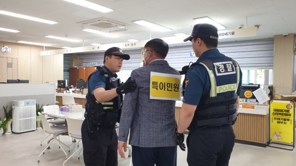또한 남해경찰서와 연계해 행정복지센터 내 배치된 비상벨을 눌러 작동여부를 확인했으며 신속 출동한 경찰에게 특이 민원을 인계해 민원실을 방문한 다른 민원인의 2차 피해에 신속하게 대처할 수 있도록 훈련을 진행했다.
