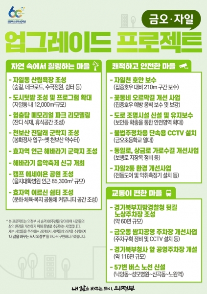 [금요저널] 의정부시는 시 승격 60주년을 맞이해 시민들의 삶의 환경을 한 단계 개선하기 위한 ‘의정부 업그레이드 프로젝트’ 금오·자일편 세부계획을 30일 발표했다.