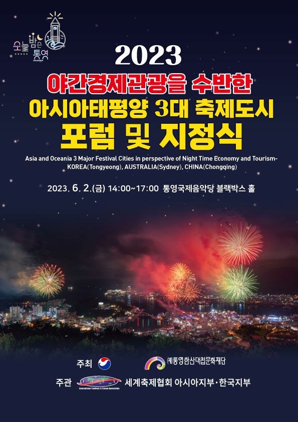 [금요저널] 통영시에서는 오는 6월 2일 오후 2시부터 ‘2023 야간경제관광을 수반한 아시아·태평양 3대 축제도시 포럼 및 지정식’을 3개국 200여명의 축제 전문가 등이 참여한 가운데 통영국제음악당 블랙박스에서 개최될 예정이다.