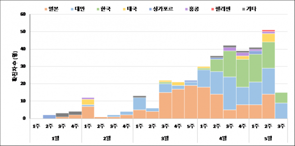 올해 3월 첫 확진환자가 발생한 이후 약 4주간 두자리수로 증가하던 확진 환자가 5월 3주 감소 후 4주에는 소폭 증가했으며 고위험군 대상 노출 전 예방접종자수는 지속적으로 증가하고 있다.