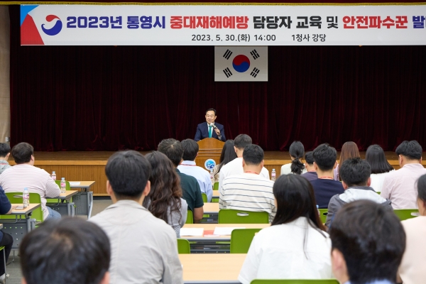 [금요저널] 통영시는 지난 5월 30일 통영시청 강당에서 중대재해예방 업무담당자, 안전파수꾼 등 70여명을 대상으로 실무자 역량강화 교육과 안전파수꾼 발대식을 개최했다.