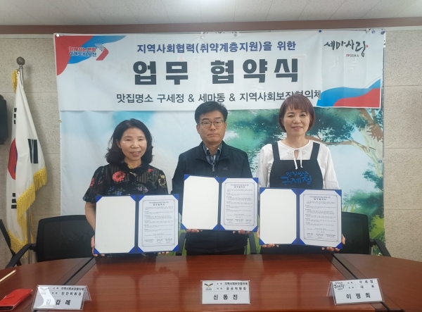 [금요저널] 오산시 세마동 지역사회보장협의체는 지난 30일 세교동에 소재한 맛집명소 구세정, 세마동행정복지센터와 함께 취약계층 식사 지원을 위한 업무협약을 맺었다고 밝혔다.