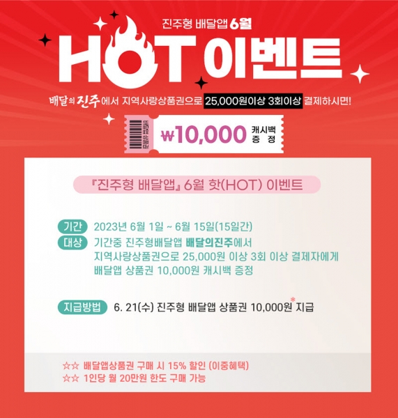 [금요저널] 진주시는 오는 6월 1일부터 15일까지 지역사랑상품권으로 2만 5000원 이상을 3회 이상 결제자에게 진주형 배달앱 상품권 캐시백 1만원을 증정하는 이벤트를 진행한다.