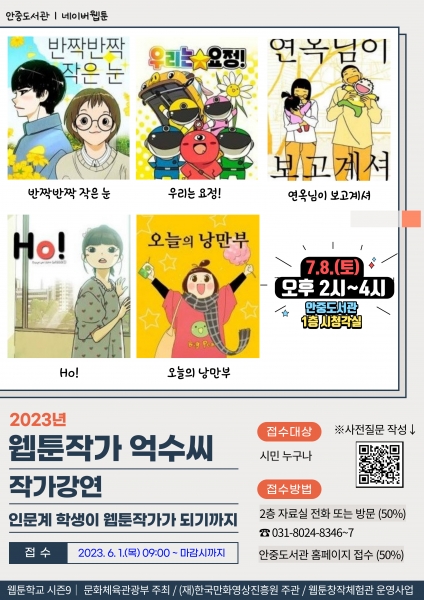 안중도서관에서 마련한 이번 작가 강연이 대중문화의 핵심 콘텐츠인 웹툰에 대한 이해를 높이는 특별한 경험이 될 것이라 기대한다.