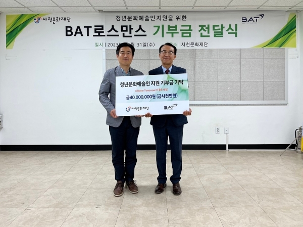 BAT로스만스는 지난달 31일 사천문화재단에서‘2023년 청년문화예술지원사업’ 기부금 전달식을 갖고 후원금 4000만원을 전달했다.