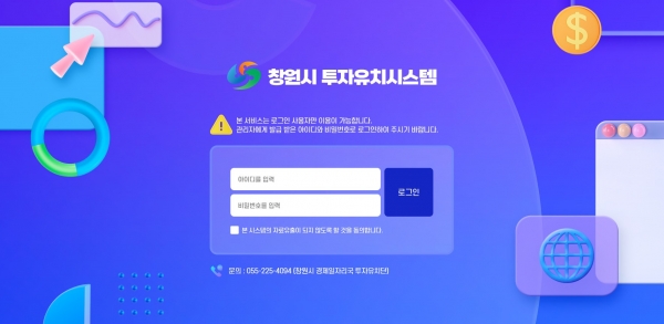 이 사업은 산재된 창원시 유휴부지 자료에 대한 통합 관리체계를 마련하기 위한 것으로 본 시스템은 기업 및 공공기관유치 업무를 담당하는 직원들의 원활한 투자유치 업무를 지원하기 위해 어디서든 활용할 수 있는 반응형 웹 사이트로 구축했다.