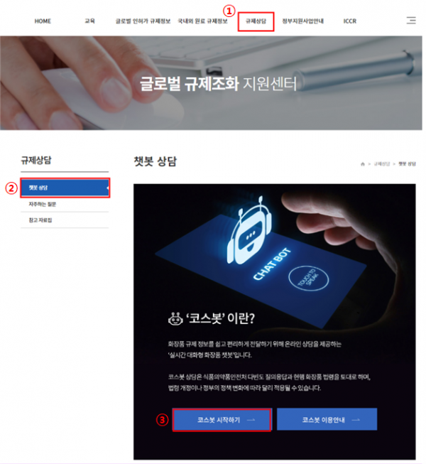 아울러 우리나라 화장품 기업의 규제 이해도를 높이고 화장품 제도와 관련한 궁금증을 신속히 해결하기 위해 실시간 상담 대화형 챗봇인 ‘코스봇’을 운영하고 있다.