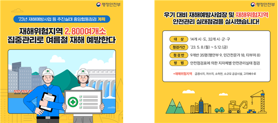 한편 지난 4월부터 급경사지, 저수지·댐, 소규모 공공시설 등 재해위험지역 120,485개소에 대해 관리기관별로 전수점검을 실시한 바 있다.