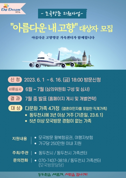 참여자 모집기간은 6월 1일부터 6월 16일까지이며 선정기준은 2023년 6월 1일 기준 동두천시에 3년 이상 거주하고 5년 동안 고향에 방문하지 못한 결혼이민자 4가족이다.