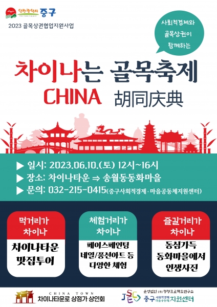[금요저널] 인천 중구 사회적경제·마을공동체 지원센터는 오는 10일 정오부터 차이나타운과 송월동 동화마을 일대에서 ‘사회적경제와 골목상권이 함께하는 ‘차이나는 골목축제’ 시즌 3’ 행사를 개최한다.