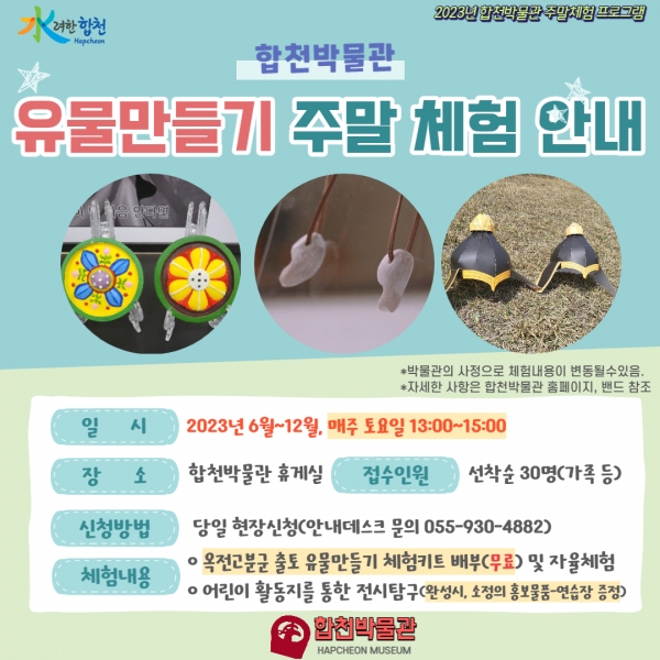 [금요저널] 합천박물관은 6월부터 12월까지 매주 토요일 오후 1시부터 3시까지 주말 체험프로그램을 운영한다고 2일 밝혔다.