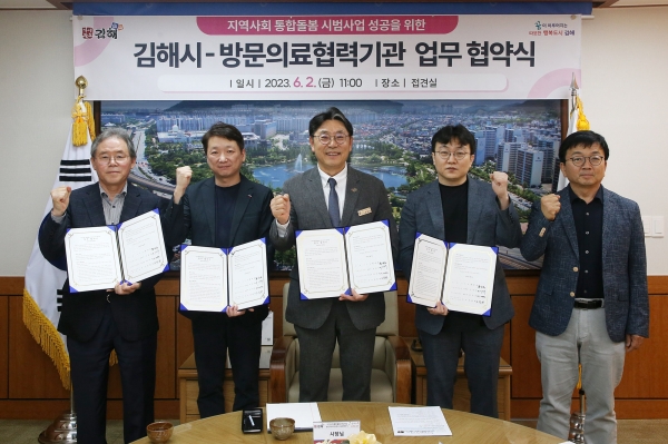 [금요저널] 김해시는 2일 시장실에서 지역사회 통합돌봄 시범사업의 하나로 3개 기관과 방문의료지원센터 업무협약을 체결했다.