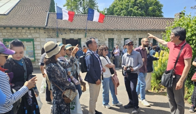 여주 여강정원추진위원들이 안효철 프랑스 정원투어 전문가로부터 프랑스 인상주의 화가 모네의 지베르니 정원에서 설명을 듣고 있다. 유진동기자