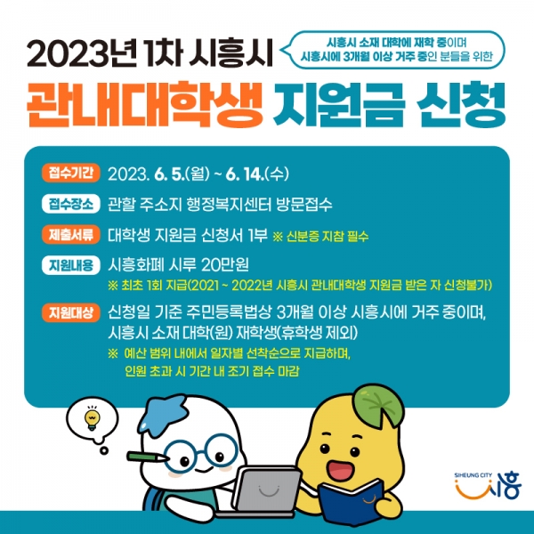 [금요저널] 시흥시는 오는 6월 5일부터 14일까지 2023년 1차 시흥시 관내 대학생 지원금을 신청받는다.