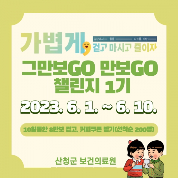 산청군은 6월 걷기 챌린지 ‘그만보GO 만보GO 1기’를 운영해 비만예방 캠페인을 실시한다고 5일 밝혔다.