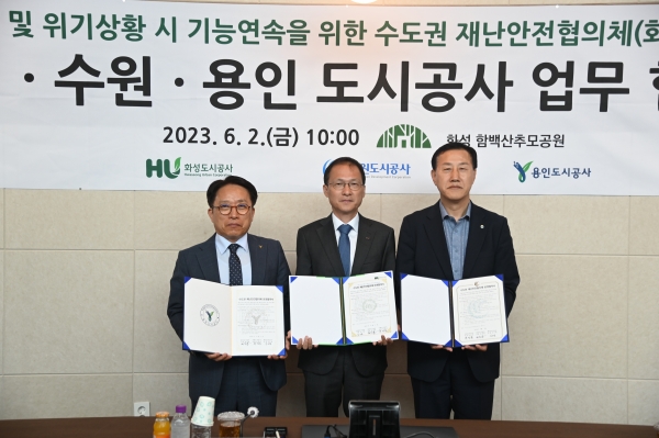 [금요저널] 화성도시공사는 화성 함백산추모공원에서 전국 최초로 수원도시공사, 용인도시공사와 함께 ‘수도권 재난안전협의체’ 본 협약을 체결했다고 5일 밝혔다.