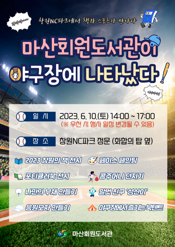 [금요저널] 마산회원도서관은 10일 오후 2시부터 5시까지 창원NC파크에서 도서관과 야구장의 이색적인 만남인 ‘마산회원도서관 홍보부스’를 운영한다고 밝혔다.