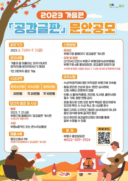 [금요저널] 부평구가 오는 7일부터 다음달 7일까지 한 달간 ‘2023년 가을편 공감글판’ 문안을 공모한다.