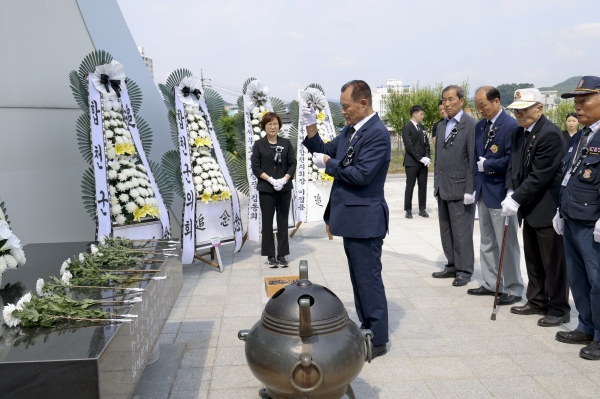 오전 10시 전국적으로 울리는 사이렌 소리에 맞춰 1분간 순국선열·호국영령에 대한 묵념을 시작으로 거행된 추념식은 보훈단체장과 기관단체장의 헌화 및 분향, 추념사, 헌시 낭송, 현충일 노래 제창의 순서로 진행됐다.
