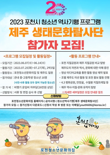 [금요저널] 포천시에서는 관내 청소년을 대상으로 제주도의 다양한 환경 및 생활방식을 탐색하고 나라사랑의 정신을 고양하는 ‘제주 생태문화탐사단’ 참가자를 모집한다.