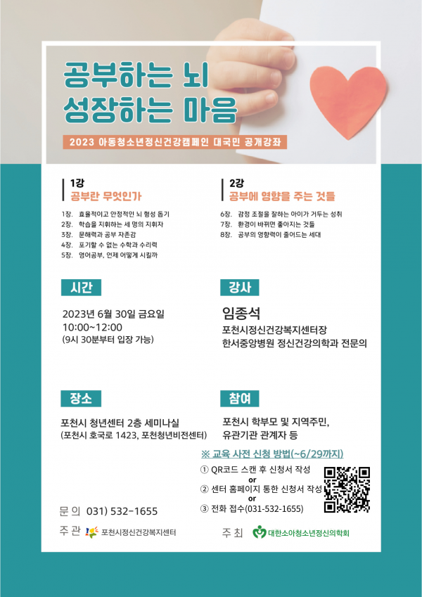 [금요저널] 포천시 정신건강복지센터는 ‘공부하는 뇌, 성장하는 마음’이라는 주제로 2023년도 아동 청소년 정신건강 캠페인 대국민 공개강좌를 오는 6월 30일 오전 10시에 포천시 청년센터 세미나실에서 개최한다.