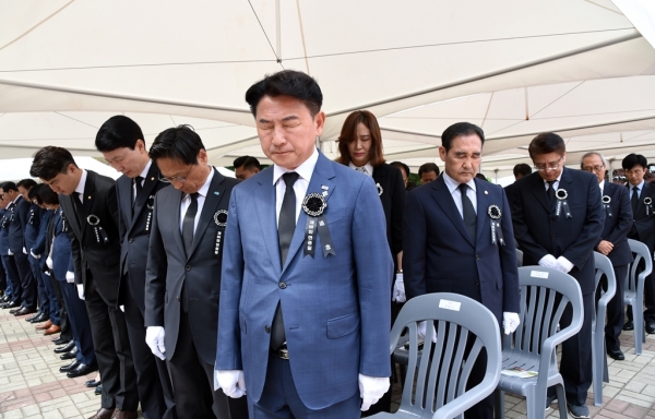 이날 추념식은 오전 10시 추념 사이렌을 시작으로 순국선열 및 호국영령에 대한 묵념, 헌화·분향, 추념사, 추도사, 추모헌시 낭독, 현충일 노래 제창 등 현충일에 맞게 엄숙하게 진행됐다.