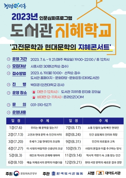 [금요저널] 시흥시 대야도서관은 ‘2023년 도서관 지혜학교-고전문학과 현대문학의 지혜콘서트’ 프로그램의 수강생 30명을 오는 19일부터 모집한다.
