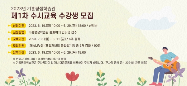 [금요저널] 용인특례시 기흥평생학습관이 오는 19일부터 29일까지 ‘제1차 수시교육 수강생’을 모집한다고 8일 밝혔다.