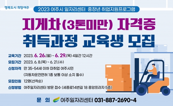 맞춤형 취업지원 프로그램의 일환으로 실시하는 3톤미만 지게차 자격증 취득과정은 여주시 거주하는 만 35세부터 54세 이하 미취업자 12명을 대상으로 실시하며 교육 희망자는 여주일자리센터로 방문신청하면 된다.
