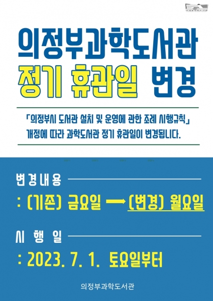 [금요저널] 의정부시는 7월 1일부터 과학도서관의 정기 휴관일을 매주 금요일에서 월요일로 변경한다고 밝혔다.
