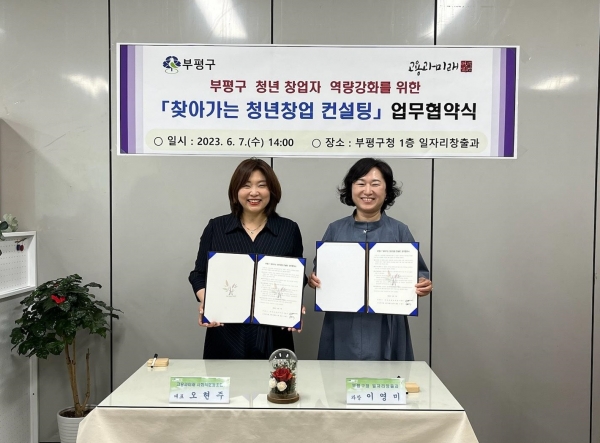 [금요저널] 부평구는 지난 7일 구청에서 고용과미래 사회적협동조합과 ‘2023년 부평구 찾아가는 청년창업 컨설팅’ 업무협약을 체결했다.