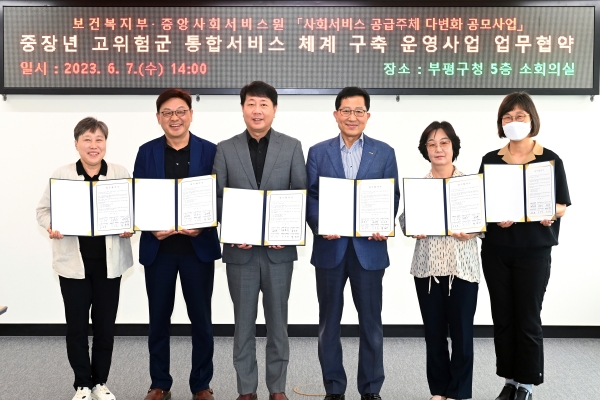 [금요저널] 부평구는 지난 7일 구청 소회의실에서 인천광역시사회서비스원 및 부평구 내 사회복지기관 4곳과 ‘중장년 고위험군 대상 통합사회서비스 체계 구축·운영사업’ 추진을 위한 업무협약을 체결했다.