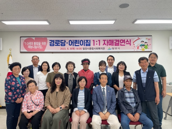 [금요저널] 밀양시는 8일 밀양시종합사회복지관에서 1·3세대 통합을 위한 재능나눔사업 추진을 위해 경로당·어린이집 1:1 자매결연식을 가졌다.