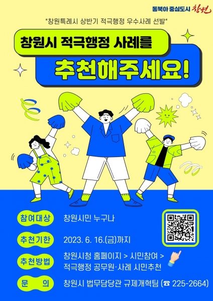 [금요저널] 창원특례시는 오는 16일까지 ‘2023년 상반기 적극행정 우수사례 선발’을 위해 창원시 홈페이지를 통해 시민에게 직접 적극행정 사례를 추천받는다고 밝혔다.