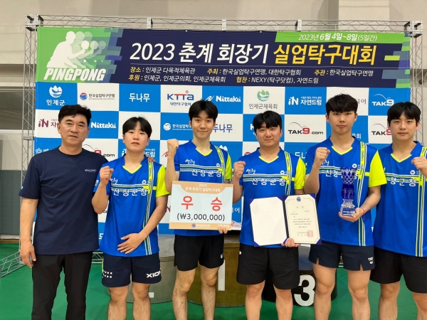 9일 산청군에 따르면 산청군청탁구단이 지난 4일부터 8일까지 강원도 인제에서 열린 ‘2023 춘계회장기 실업탁구대회’에서 단체전 우승을 차지했다.