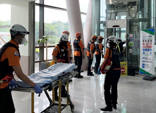 이어 승강기유지관리업체와 소방구조대가 현장에 도착해 승강기 상태를 확인 후 구조방법을 결정한 뒤 구조에 돌입했고 부상자를 응급치료해 이송하고 현장을 정리하며 훈련이 마무리됐다.