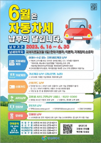 6월 정기분 자동차세는 과세기준일 현재 창원시에 등록된 차량 중 상반기 연납차량을 제외한 자동차등록원부상 소유자에게 부과되며 연세액 10만원 이하인 차량은 6월에 전액 과세된다.