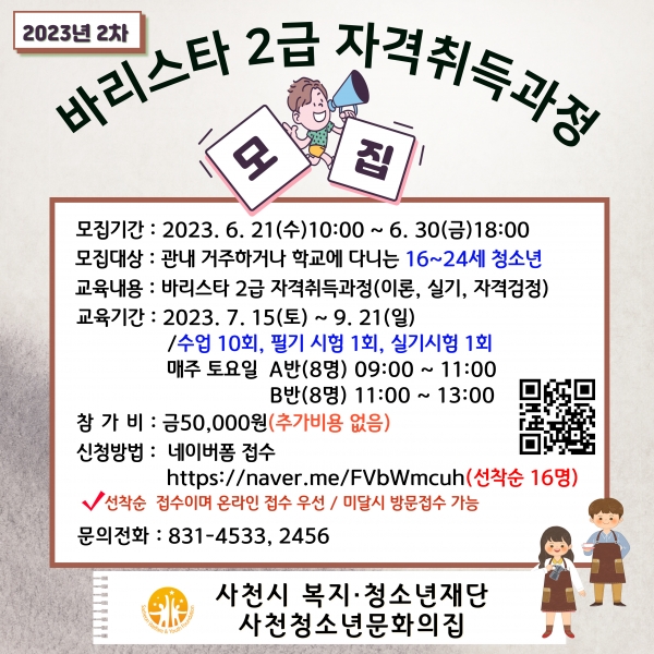 [금요저널] 사천시 복지·청소년재단 소속 사천청소년문화의집은 관내 청소년들의 건전한 여가 확보와 진로 탐색에 도움을 주고자 ‘바리스타 2급 자격취득과정’ 2차 수강생을 모집한다.